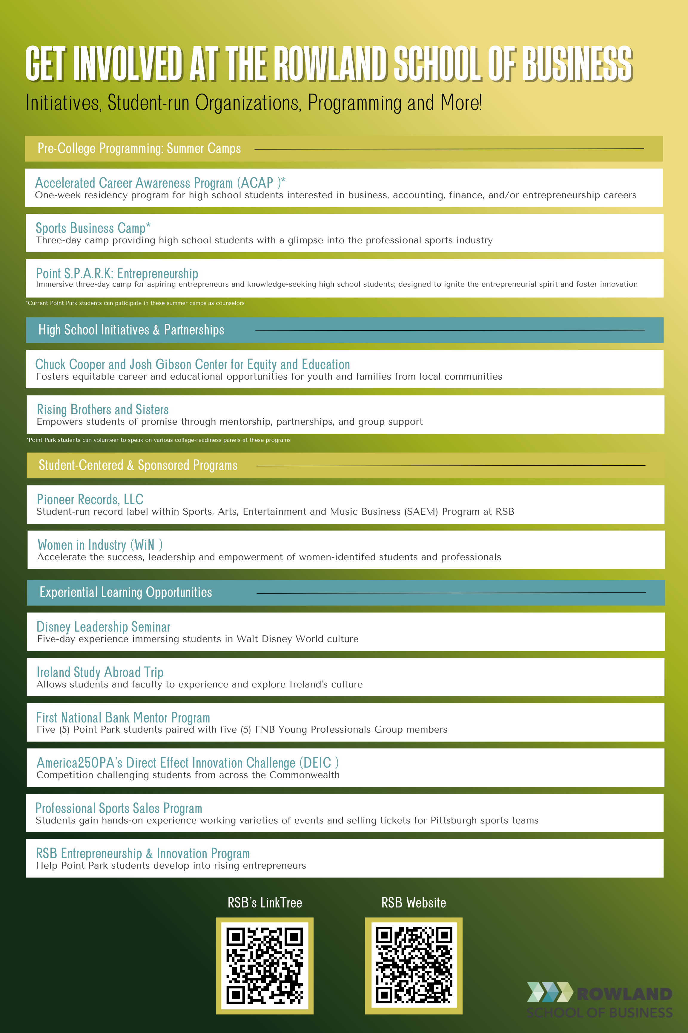 - Rising Brothers and Sisters, a mentorship program that seeks to increase the representation of successful professionals of color on Point Park's campus and in high schools.